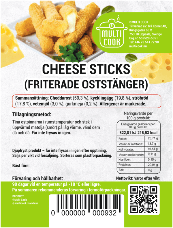 Cheddarost(59, 3 %), kycklingägg(19, 8 %), ströbröd(17, 8 %), vetemjöl(3, 0 %), gurkmeja (0, 2 %).
