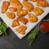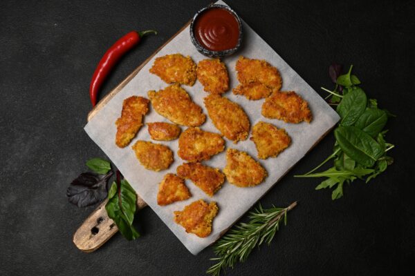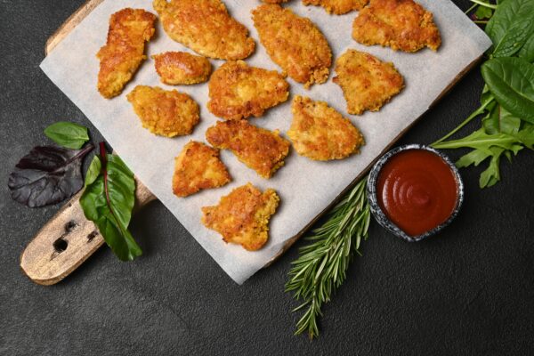 kycklingfilé (50, 00 %), majsflingor (28, 00 %), komjölk (8, 80 %), vetemjöl (7, 70 %), kycklingägg (3, 30 %), bordssalt (0, 66 %), vitt kristallint socker (0, 44 %), kycklingkrydda (0, 33 %), torkad vitlök (0, 22 %), malen paprika (0, 22 %), malen svartpeppar (0, 11 %).