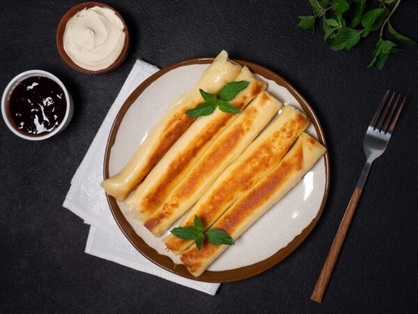 Lövtunna och sammetslena mlyntsi, skapade med precision för att smälta i munnen. Dessa ukrainska pannkakor är en hyllning till hantverkstradition.