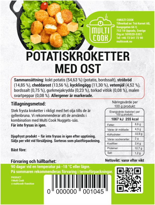 kokta potatisar (54, 63 %) (potatis, bordssalt), ströbröd (14, 85 %), cheddarost (13, 56 %), kycklingägg (11, 30 %), vetemjöl (4, 52 %), bordssalt (0, 75 %), gurkmejakrydda (0, 23 %), torkad vitlök (0, 08 %), malen svartpeppar (0, 08 %).