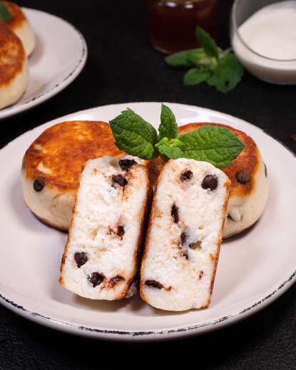Syrnyky (cottage cheese pancakes) med chokladdroppar